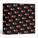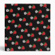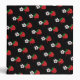 A pretty pattern of red strawberries with tiny white flowers, set against a black background.