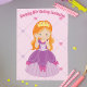 These adorable pink princess happy birthday card features a drawing of a pretty redhead little girl wearing a beautiful pink ball gown. Personalize this cute children's birthday card with your child's name between the fun heart pattern.