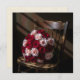 Pretty blank card with a beautiful bouquet of pink and red roses laying on an old rustic wood chair.
