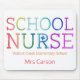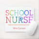 Personalized School Nurse Rainbow Typography Mouse Pad for Desk. Watercolor texture rainbow letters spelling SCHOOL NURSE. Personalized with school, name or other information. Fun gift for your favorite school nurse. Colorful and modern typography.