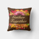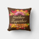 Pretty Fall / Thanksgiving themed throw pillow features an Autumn watercolor illustrated split wreath of leaves with centered "Gather Together" customizable text on dark brown background.