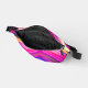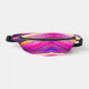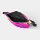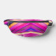 A fanny pack with a colorful, abstract design is displayed against a plain white background. The design features a series of diagonal lines that converge to form a chevron pattern. The colors include shades of pink, purple, blue, yellow, and orange, creating a vibrant and eye-catching effect. The fanny pack has a black zipper closure along the top and a black adjustable strap. The overall style is modern and playful, making it a fashionable accessory.