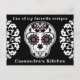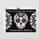 A postcard in which to write a recipe on the backside, is decorated with a sugar skull with damask accents in black, white, and fuchsia. Add your name and other text to the front.