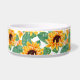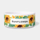 Personalized pet bowl with a cute summery pattern. Pretty yellow sunflowers surrounded by green leaves in a repeating pattern.