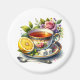 Pretty ai art depicting a pretty antique teacup full of tea with a lemon wedge and sugar cubes and roses on the side.