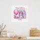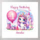A pretty unicorn is celebrating her first birthday with gifts, a pink balloon, and a pink castle. Perfect for a baby girl's first birthday party. Add your own customized text.