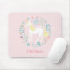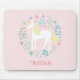 A pretty mouse pad featuring a cute unicorn and floral design on a blush pink background. Personalize it with a name.