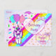 Personalize these adorable girl's birthday party invitations with a magical unicorn, hearts, bows, balloons, sprinkles, butterfly and rainbow. Pink, purple, blue, yellow and orange girl's birthday.