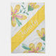 Yellow tea towel with a watercolor design - colors: yellow, pink, light grey. Personalize for a special gift.