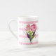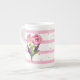 Pretty pink and white striped bone china mug, with small green polka dots and beautiful watercolor flower bouquets. Personalize the green text for yourself or as a lovely gift idea for her.