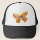 A hat embellished with a delicate watercolour painting of an orange/red butterfly.