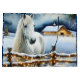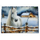 A pretty white horse standing behind an old rustic wood fence with a snowy background and vintage old red barn. Sides are dark blue with white snowflakes. The snow-filled fence is adorned with illuminated Christmas lights to give a warm festive feel to your country Christmas gift bag.