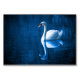 A lovely nature scene of a white swan swimming on a peaceful blue lake. The dark blue shadows contrasts nicely with the soft blue lighting on this peaceful swan.