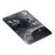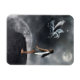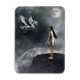A pretty, white-winged fairy waits on top of a mountain and watches a beautiful white flying horse come toward her. This is against a background of a starry sky with a moon and a magical planet.
