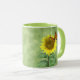 Enjoy your favorite drink in this mug that features a pretty orange monarch butterfly visiting a bright yellow sunflower on a green background.