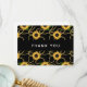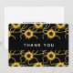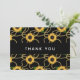 Flat thank You card with an elegant and stylish pattern. Pretty yellow sunflowers and green leaves surrounded by delicate gold chains. Black background.