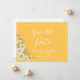 Pretty Save the Date announcement features watercolor white daisies corner on daffodil yellow background with white customizable text blocks in modern fonts
