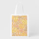 I own a lot of reusable grocery bags, but this one holds its box shape and simply stands up on its own even if there is nothing in it. Its stiffer than your regular reusable bag too, and the material is water resistant. I poured water on the exterior and it didn't penetrate inside to the other side. I'm buying a couple more. Wish I knew how durable these bags were or I would have purchased a few more with my initial order. I also like how it folds and buttons up when not in use, making it easy to put into a handbag or luggage. I haven't used this bag yet, as I purchased it for travel use, like when you're at the airport and need to small sturdy bag to place any airport purchases in, like food, souvenirs etc. I can tell you when you first see this bag, it looks very cheap, but after closer inspection of the material and the seams its a very sturdy reusable bag. I tested it out by putting some really heavy objects inside and I could not observe any stress to the bag at all. Another thing I like about it, is the fact the medium size that this is makes it easy to just carry it in your hand without the bottom of the bag scraping the ground, like most other bags do when you're short. That alone, deserves 5 stars. I just wish there were more colors to choose from! The PDX Airport Carpet printing looks just like the photo, and using this bag during travel might be a conversation piece when/if a native from Oregon happens to see it.