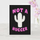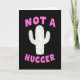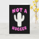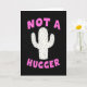 This greeting card features a cream-colored saguaro cactus centered on a deep black background. The cactus has two arms that curve upward like it’s ready to hug, but its face is neutral and it’s covered in short black dash marks and tiny white spines. Above the cactus, the text “NOT A” appears in hot pink, in thick, slightly slanted simple lettering near the top. Below the cactus, the word “HUGGER” is also in hot pink and matches the same thick lettering near the bottom. The bright pink words frame the cactus and make the message feel funny and clear at the same time. The high contrast between the black background, cream cactus, and pink text makes everything easy to notice right away. It’s a sweet choice for someone who likes a little humor with their Valentine’s message 💘😘