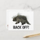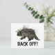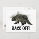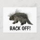 Send this card to get bill collectors or meddling in-laws off your back. Image features a porcupine and the warning "Back Off!" A porcupine is any of 29 species of rodent from a number of families. Porcupines are indigenous to the Americas, southern Asia, and Africa. Porcupines are the third largest of the rodents, behind the capybara and the beaver. Most porcupines are about 25–36 in (63–91 cm) long, with an 8–10 in (20–25 cm) long tail. Weighing between 12–35 lb (5.4–16 kg), they are rounded, large and slow. Porcupines come in various shades of brown, grey, and the unusual white. Porcupines' spiny protection resembles that of the unrelated hedgehogs and echidnas. The name porcupine comes from Middle French porc espin (spined pig) A regional American name for the animal is quill pig. The North American porcupine, Erethizon dorsatum, has the northernmost range of all the world's porcupines. Evidence indicates that they have only been a part of North American fauna sincemillion they immigrated north from South America some three million years ago. Porcupines are 25 to 31 inches long covered with hair and quills of varying length, except on the foot pads and nose. The tips of the long guard hairs are lighter and give the coat hues of yellow or white. The hair and a thick layer of body fat helps keep the porcupine warm during the winter. The tail is extremely muscular and adapted to aid in climbing and defense. The upper surface of the tail is heavily covered with quills, while the underside is covered in bristle-like hairs used to aid in climbing. The quilled pelage of the porcupine makes it unique among North American mammals. Quills cover the body, except on the legs and belly. The quills are modified hairs which have microscopic barbs on the tips and are filled with a spongy matrix. Quills from different parts of the body vary in length, flexibility, color, shaft diameter, and barb length. The average weight of an adult male porcupine ranges from 15 to 18 pounds, but some individuals can weigh up to 30 pounds. Adult females weigh about 2-4 pounds less than males. Porcupine have excellent senses of smell, hearing, and taste, but relatively poor eyesight. Porcupines make a wide variety of sounds ranging from whimpers to screams, depending upon the circumstance. Breeding takes place in the fall months from late September to early November. Males seeking receptive females expand their home ranges up to five times the normal size. If more than one male shows interest in the same female, they will fight for the opportunity to mate with the female. Males use their incisor teeth and quills when fighting, and usually it is the largest and heaviest male which wins dominance. The breeding male then splashes the female with urine. If she is not ready to mate, she shakes off the urine and leaves. If she is ready, she stays and the male mounts in the traditional posture with the female in front and the male in the rear. She will curl her tail over her back, covering most of the quills. Males reach maturity at 24 months and females at 12 months. After a gestation period of about 210 days, only a single young is born. The gestation period is extremely long for a rodent, twice the time for a beaver. At birth the young weighs between 1 and 2 pounds and is about 10 inches long. Its eyes are open and its body covered with long grayish-black hairs and quills. Within a matter of hours the quills dry and serve as protection. The young porcupine is then capable of following its mother, although the young will not be able to climb large trees for several weeks. The young are able to eat some vegetation after a few weeks, but the female continues nursing the young for 3.5 months. During the summer the young stay close to their mothers, learning about den sites and food trees, but toward the end of summer they start to spend more time apart. By October, when the female mates again, the young are fully weaned and wander off to face the winter alone. Porcupines utilize natural cavities, such as rock caves, hollow logs and trees, or even the thicker vegetation in a tree as dens. In areas without snowfall, dens are not used so much. Porcupines stay active throughout the winter. Porcupines are primarily arboreal, and spend most of their time in the winter feeding in trees. While powerful climbers, porcupines do occasionally fall from trees. Thirty percent of the animals examined in one study showed evidence of healed fractures indicating that they had fallen out of trees. When climbing, the porcupine uses the stiff bristles on the undersurface of the tail as support. The animal has long, curved front claws which also aid in climbing. The inner bark (phloem and cambium layers) of spruce, birch and hemlock and spruce needles are the major winter foods for porcupine living in Alaska. In the spring and summer, buds and young green leaves of birch, aspen, cottonwood and willow are eaten until the tannin levels build too high for the porcupine to tolerate. Because they are vegetarians and most vegetable matter is very low in sodium, porcupines need additional sodium in the blood to balance cell potassium levels. As a result, porcupines seek out salt sources such as natural licks, glue which bonds plywood together, human perspiration on tools, road salt, and some paints. Porcupines also feed on shed antlers and the bones of dead animals to obtain sodium and calcium. Most carnivores would not pass up a meal of porcupine. However, an encounter between a young inexperienced predator and a porcupine can be a very painful experience. Some unfortunate carnivores have starved to death because a mouthful of quills has prevented them from eating. In an effort to remove the quills, the predator can cause the barbed quills to work into the deep tissues. Predators have different means of killing and eating porcupines. In the Northeast United States, the fisher has learned to specialize on a diet of porcupine. The fisher circ