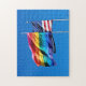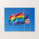 A vibrant jigsaw puzzle featuring a billowing rainbow Pride flag along with an American flag, set against a perfect blue sky. Celebrating a welcoming, diverse America. Photographed at Cherry Grove on Fire Island. Part of the Pride Collection.