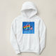 A comfy hoodie featuring a billowing rainbow Pride flag along with an American flag, set against a brilliant blue sky. Celebrating a welcoming, diverse America. Photographed at Cherry Grove on Fire Island. Part of the Pride Collection.