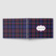 Plaid wedding guest book done in the classic regency blue, plum, green, black and white Pride of Scotland tartan plaid pattern. A white decorative oval text area, on the front of the book, has custom text ready to personalize for your wedding.