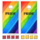 This Cornhole Set is decorated with watercolor stripes in rainbow colors and says "Pride" in black typography.