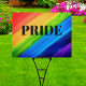 This colorful yard sign features watercolor stripes in rainbow colors and the word "PRIDE" in black typography.