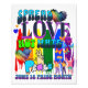 Spread Love Not Hate Poster for Pride Month. Graphics include hearts, rainbows, peace sign.