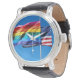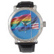 A classic watch featuring a billowing rainbow Pride flag along with an American flag, set against a perfect blue sky. Celebrating a welcoming, diverse America. Photographed at Cherry Grove on Fire Island. Part of the Pride Collection.