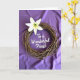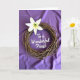 Designed with a serene, thoughtful look, this Easter card centers on a rustic circular wreath made from slender brown twigs that loop into a cozy frame. Behind it, soft violet fabric drapes in gentle folds, adding depth and a quiet, romantic calm, like a tender pause shared between close friends. At the top of the wreath sits a single white blossom 🌷, its petals opening softly around a pale green-yellow center. Inside the wreath, white lettering is placed neatly in the middle, reading “To a Wonderful Priest,” in smooth, flowing letterforms that feel gentle rather than formal. The bright text stands out clearly against the darker twigs and purple backdrop, as if the message is being held safely within the circle. Soft, diffused lighting highlights the contrast between the rough branches, the silky flower, and the creased fabric, giving everything a warm, respectful glow 🐇. The violet cloth shows subtle wrinkles and shadowed folds radiating outward behind the wreath.
