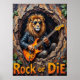 This compelling artwork portrays a lion, looking effortlessly cool in sunglasses and a leather jacket, delivering "primal strums" on an electric guitar from within a textured tree hollow. The natural woodland elements subtly frame the scene, while the prominent "Rock or Die" message reinforces the raw energy. The thick, expressive impasto creates a tangible texture, making the lion's passion for music truly resonate