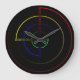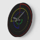 A very unique minimalist wall clock design, with the 3, 6, 9 and 12 hour marks marked with the appropriate number of small circles and then one circular line which starts out bright and gradually fades as it moves clockwise around the clock face. The background is solid black with the hour markers depicted in bright red, yellow, blue and green. Makes a very unique and modern wall decor piece, and it's actually easy to read the time!