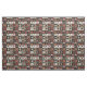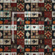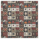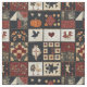 This fabric features a folk art patchwork aesthetic, arranged in a grid of square blocks that blend both appliqué and pieced elements. Appliquéd motifs include a bold orange pumpkin, a black crow, red hearts, chickens, and stylized florals, while the pieced blocks showcase traditional geometric quilt patterns such as stars, diamonds, and crosses. The use of deep reds, creams, and dark blues/blacks, accented with patterned fabrics like polka dots, florals, and textured solids, creates a warm and rustic style. Perfect for farmhouse décor, country living, primitive crafts, and seasonal quilts, this design embodies the charm of traditional quilting with a cozy, handmade feel.