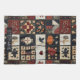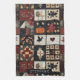 This kitchen towel features a folk art patchwork aesthetic, arranged in a grid of square blocks that blend both appliqué and pieced elements. Appliquéd motifs include a bold orange pumpkin, a black crow, red hearts, chickens, and stylized florals, while the pieced blocks showcase traditional geometric quilt patterns such as stars, diamonds, and crosses. The use of deep reds, creams, and dark blues/blacks, accented with patterned fabrics like polka dots, florals, and textured solids, creates a warm and rustic style. Perfect for farmhouse décor, country living, primitive crafts, and seasonal quilts, this design embodies the charm of traditional quilting with a cozy, handmade feel.