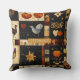 This throw pillow features a folk art quilt-inspired patchwork pattern with a warm autumn palette of orange, brown, gold, black, and cream. The blocks showcase rustic motifs including pumpkins, birds, stars, hearts, and swirling vines, all arranged in a traditional quilt block structure. With its distressed, aged fabric look, this pattern captures the charm of primitive Americana and seasonal harvest themes. Perfect for fall décor, rustic farmhouse style, country crafts, and folk-inspired designs that celebrate the cozy spirit of autumn.