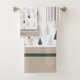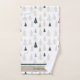 Personalize a guest towel with a name or other text and spruce up your rustic theme bathroom with this towel set printed with a pattern of primitive pine tree shapes. Choose the set or separates in the drop down menu. Created in earth tone colors of tan, light blue gray and dark slate gray on a white background and tan border and dark gray accents. See other coordinating items in this design collection on Zazzle.