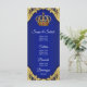 Prince baby shower menu with beautiful royal blue crown on an elegant royal blue and gold swirl background. These royal blue and gold prince baby shower menus are easily customized for your event by simply adding your details in the font style any layout you prefer.