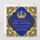 Prince baby shower save the date postcards with magnetic background and beautiful royal blue and gold crown and swirl background. You can easily customize these prince baby shower save the dates by simply adding your details in the font style and wording of your choice.
