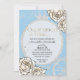 This elegant custom party invitation features a Cinderella fairytale princess theme on a baby blue colored background. The classic fairy tale phrase, "Once upon a time" is printed in a gold font above the event information, inside a white glitter princess carriage. Stained glass white roses appear in the top right and bottom left corners.