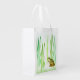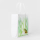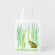 This cute reusable grocery bag features a small female green frog with a yellow belly sitting among the grasses at the pond. She seems lonely as if she is waiting for her Prince Charming to appear.