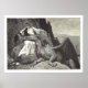 Drawing of a pet dragon with wings nestled on the lap of a medieval princess or queen with long hair and a flowing dress, sitting at the base of a mountain. In the distance, a sailing ship is anchored in a harbor while a sailor climbs the rocks to catch a glimpse of the dragon and the maiden.
