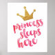 Princess sleeps here poster print features modern hand written typography in pink with a faux gold crown. A lovely gift for a newborn baby girl.