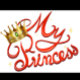 Illustration of the words "My Princess" in red cursive with a golden crown on top of the "P" in Princess, the crown has a green gem in the center and small yellow stars around the words.