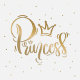 Illustration of the word "Princess" in a stylized, cursive font, rendered in a metallic gold color. The word is adorned with small crown icons placed above the "i" and between the "P" and "r". A larger crown is positioned above the word, adding to the regal theme. The background is a clean white, scattered with small gold dots that create a subtle, festive effect. The overall style is elegant and decorative, suitable for celebratory or themed designs.