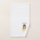 Cute girl's bath towel set done in a princess theme. The bath towel is done in white with a golden yellow crown pattern. The hand towel is white with cartoon graphics of a brunette princess dressed in yellow, with custom name done in an arched brown text. The wash cloth is done in a yellow and white quatrefoil pattern with one large crown. Sweet towel set for any young girl's bathroom.