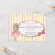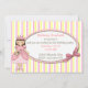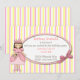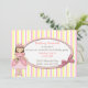 Pretty girl's Princess birthday invitation, done in a white, pink and yellow striped background. An oval text area sits on top, with graphics of a pink bow, on the right side and country primitive graphics of a girl Princess, on the left side. Personalize the text for your child's birthday party. You're daughter will feel like a real Princess, with these sweet invitations to her party. Matching products available.