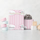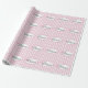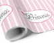 This wrapping paper features the word princess with pink hearts and set on a pink and white striped background.