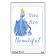This wall decal has an image of a princess dressed in a beautiful blue ball gown. Text of "You Are Beautiful". Has light blue borders on four sides. Shown in the Emerald cut.